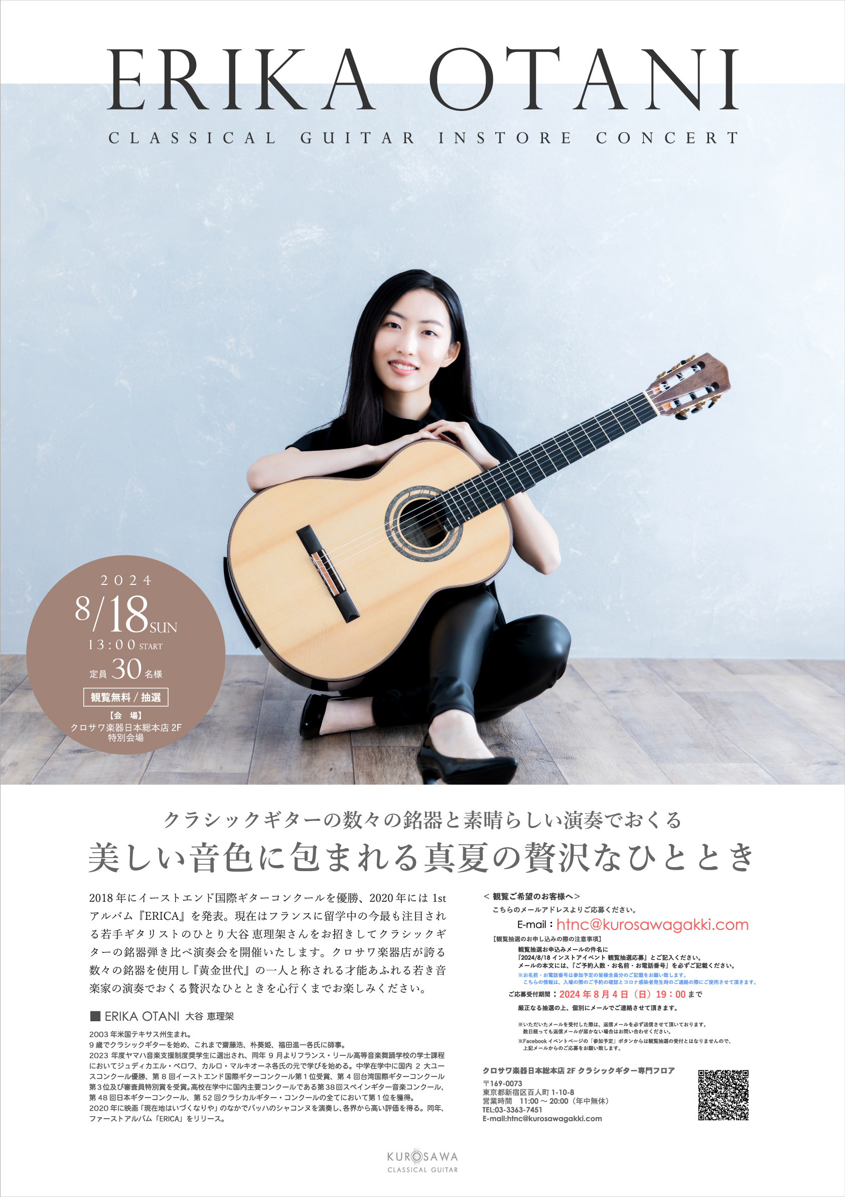 2018年にイーストエンド国際ギターコンクールを優勝、2020年には1stアルバム『ERICA』を発表。現在はフランスに留学中の今最も注目される若手ギタリストのひとり大谷 恵理架さんをお招きしてクラシックギターの銘器弾き比べ演奏会を開催いたします。クロサワ楽器店が誇る数々の銘器を使用し 『黄金世代』の一人と称される才能あふれる若き音楽家の演奏でおくる贅沢なひとときを心行くまでお楽しみください。