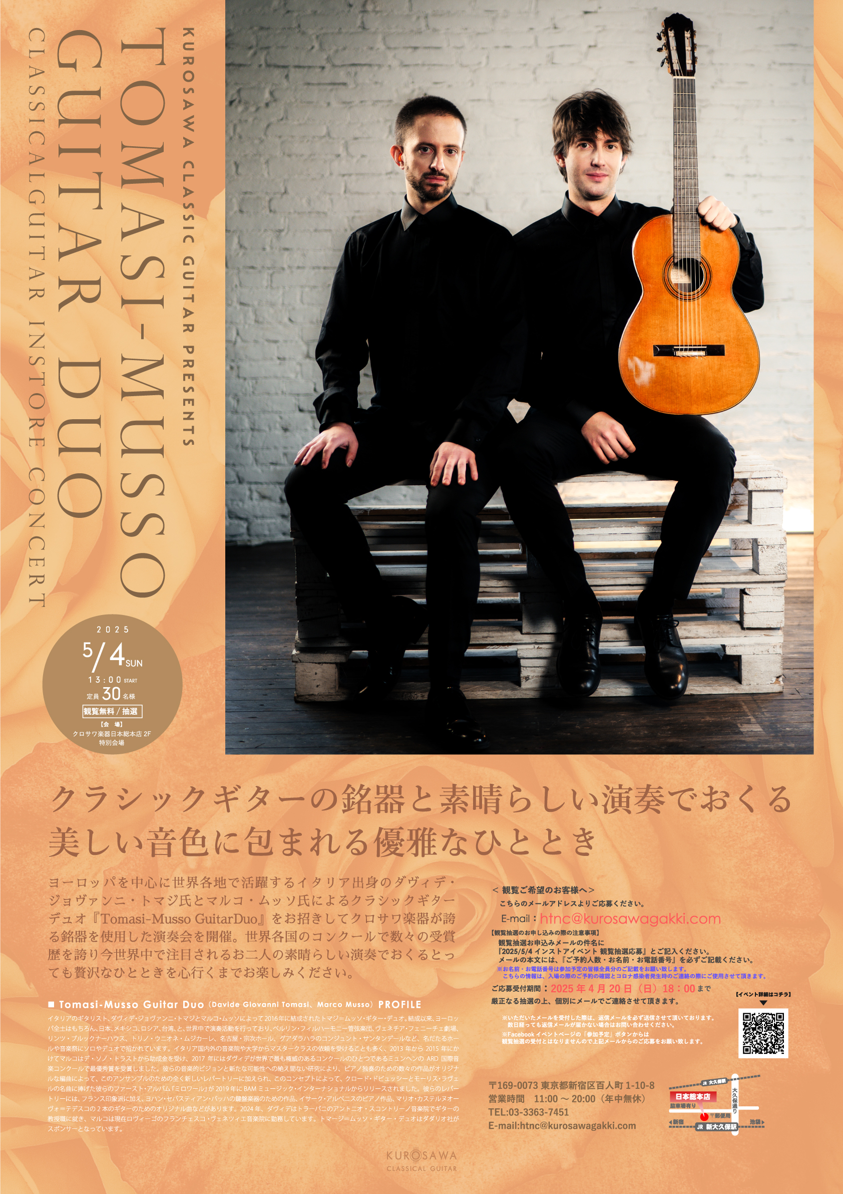 イタリアのギタリスト、ダヴィデ・ジョヴァンニ・トマジとマルコ・ムッソによって2016年に結成されたトマジ=ムッソ・ギター・デュオ。結成以来、ヨーロッパ全土はもちろん、日本、メキシコ、ロシア、台湾、と、世界中で演奏活動を行っており、ベルリン・フィルハーモニー管弦楽団、ヴェネチア・フェニーチェ劇場、リンツ・ブルックナーハウス、トリノ・ウニオネ・ムジカーレ、名古屋・宗次ホール、グアダラハラのコンジュント・サンタンデールなど、名だたるホールや音楽祭にソロやデュオで招かれています。イタリア国内外の音楽院や大学からマスタークラスの依頼を受けることも多く、2013年から2015年にかけてマルコはデ・ソノ・トラストから助成金を受け、2017年にはダヴィデが世界で最も権威のあるコンクールのひとつであるミュンヘンのARD国際音楽コンクールで最優秀賞を受賞しました。彼らの音楽的ビジョンと新たな可能性への絶え間ない研究により、ピアノ独奏のための数々の作品がオリジナルな編曲によって、このアンサンブルのための全く新しいレパートリーに加えられ、このコンセプトによって、クロード・ドビュッシーとモーリス・ラヴェルの名曲に捧げた彼らのファースト・アルバム『ミロワール』が2019年にBAMミュージック・インターナショナルからリリースされました。彼らのレパートリーには、フランス印象派に加え、ヨハン・セバスティアン・バッハの鍵盤楽器のための作品、イサーク・アルベニスのピアノ作品、マリオ・カステルヌオーヴォ=テデスコの2本のギターのためのオリジナル曲などがあります。2024年、ダヴィデはトラーパニのアントニオ・スコントリーノ音楽院でギターの教授職に就き、マルコは現在ロヴィーゴのフランチェスコ・ヴェネツィエ音楽院に勤務しています。トマージ=ムッソ・ギター・デュオはダダリオ社がスポンサーとなっています。