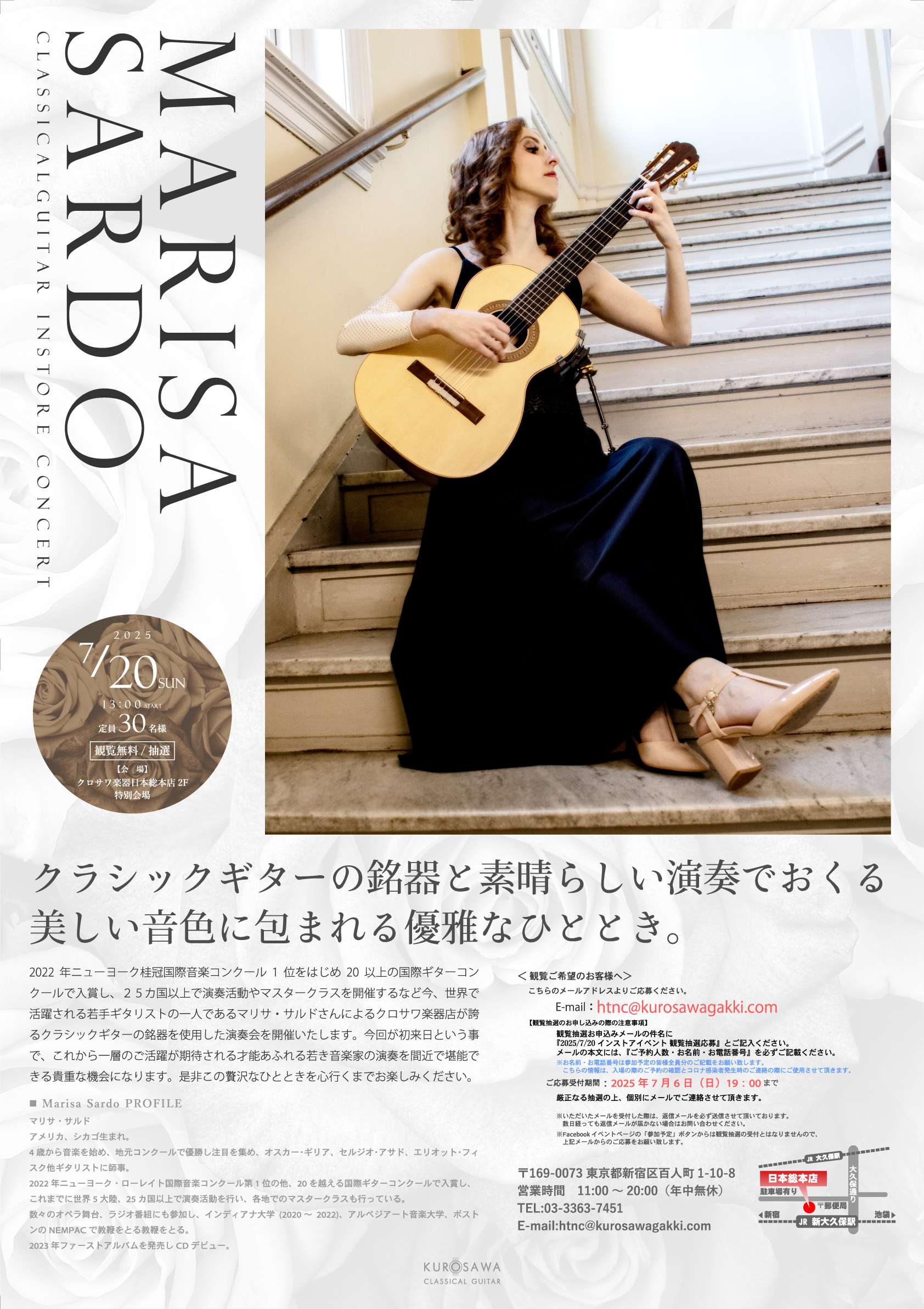 2022年ニューヨーク桂冠国際音楽コンクール1位をはじめ20以上の国際ギターコンクールで入賞し、25カ国以上で演奏活動やマスタークラスを開催するなど、今、世界で活躍される若手ギタリストの一人であるマリサ・サルドさんによるクロサワ楽器店が誇るクラシックギターの銘器を使用した演奏会を開催いたします。今回が初来日という事で、これから一層のご活躍が期待される才能あふれる若き音楽家の演奏を間近で堪能できる貴重な機会になります。是非この贅沢なひとときを心行くまでお楽しみください。
