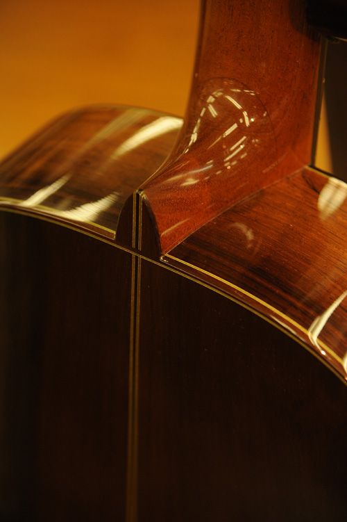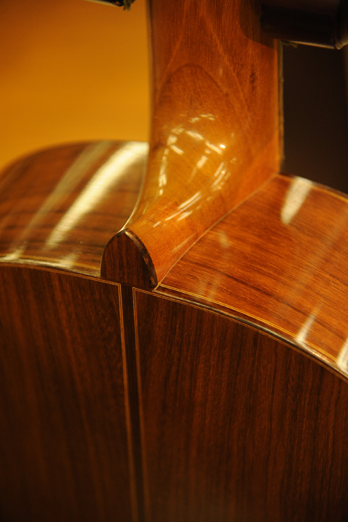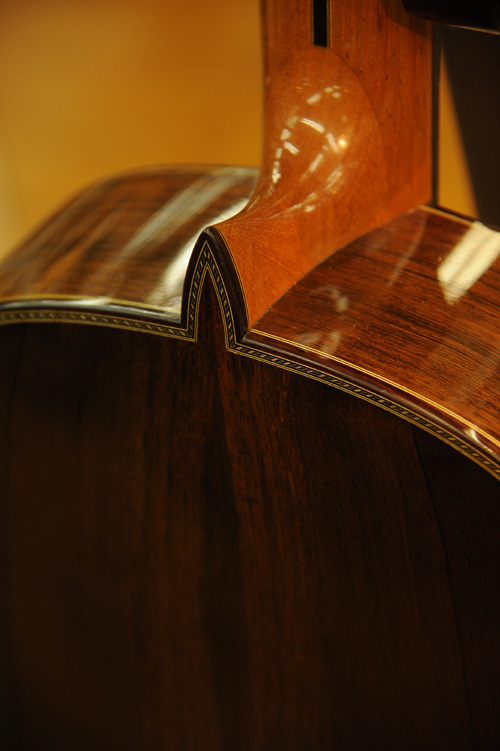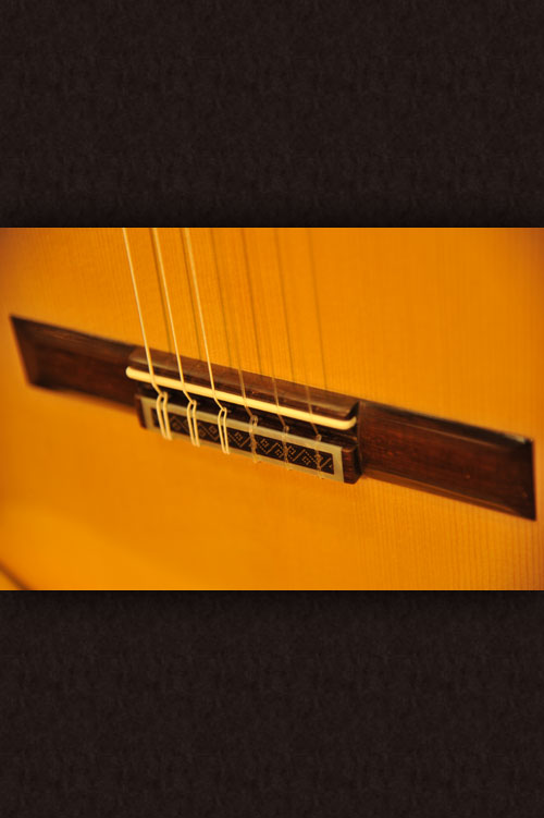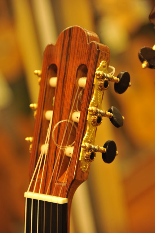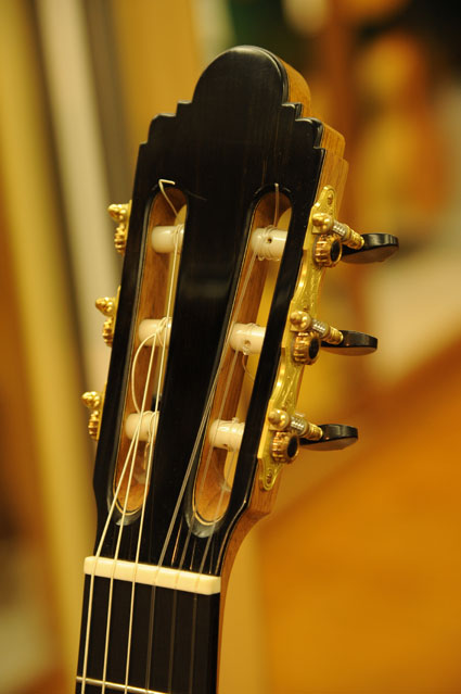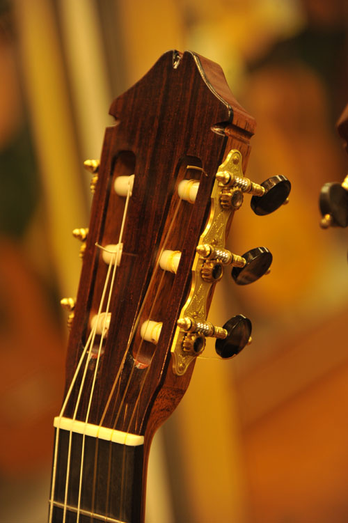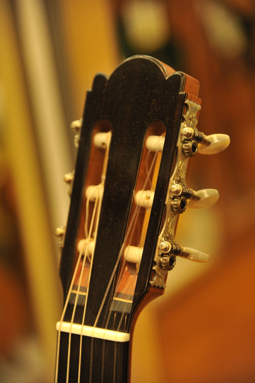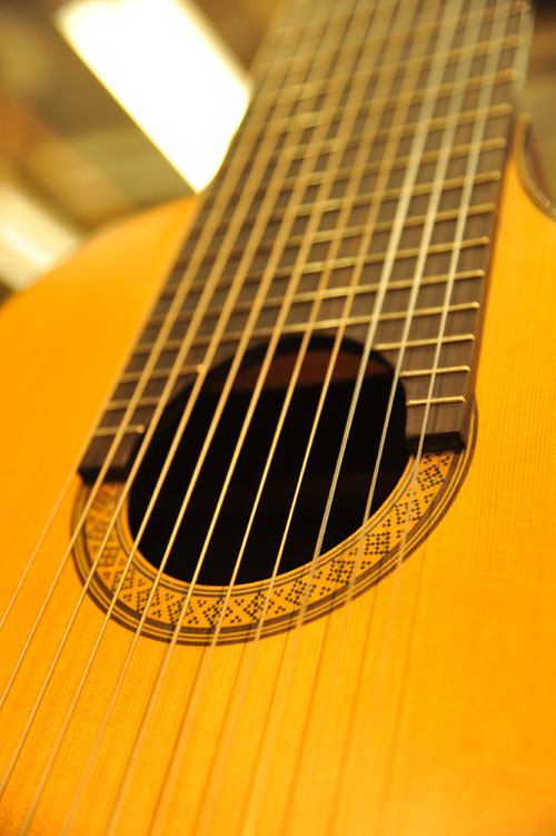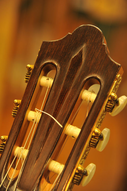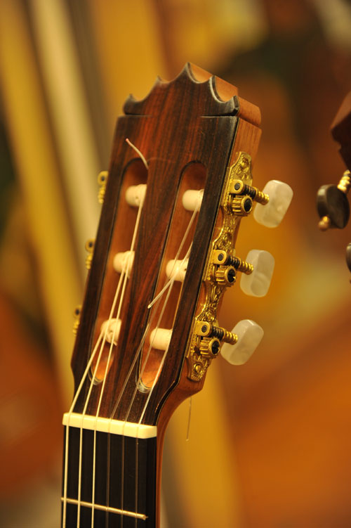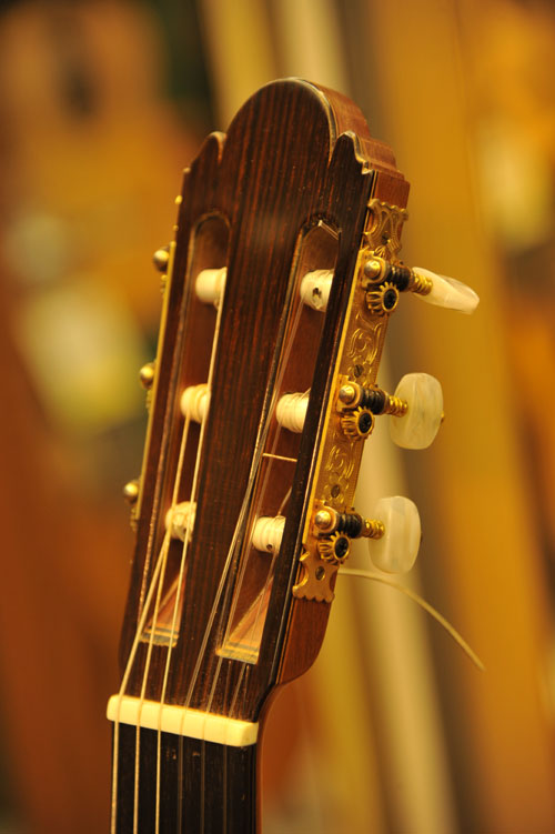「禁じられた遊び」があまりにも有名な、名手ナルシソ・イエペスの要求を満たすために研究を重ね、1973年に先代パウリーノ・ベルナベの手で完成された10弦ギターは、6弦ギターでは音程によって差が生じる開放弦の共鳴音が12音全ての音程で鳴るように設計・製作されている。 |