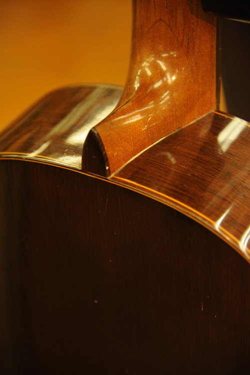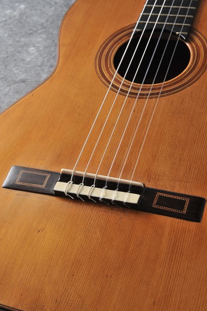 このギターは1963年、杉材の使用が始まったころの表板に松材 を用いた貴重な1本。 60年代当時は製作を行った職人のイニシャルが、ボディ内部、ネックヒールにスタンプされており、「PB」は、セゴビアにも用いられ、その後独立した銘工パウ リーノ・ベルナベのスタンプであり、工作精度の高さと「松」材ならではの凝縮した密度の音色が素晴らしい。 なお、特定のスタンプへ需要が集中した為、80年代以降はスタンプは施されていない。 |