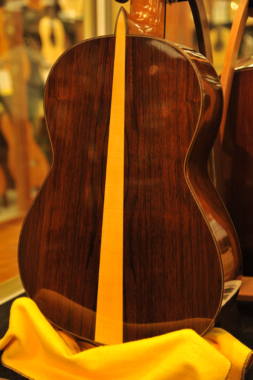 先代は2007年に惜しまれつつ他界されたが、17 歳から工房で30年以上に渡り共に製作を行ってきた当代のパウリーノ・ベルナベにその製作技法は確実に受け継がれている。 現代を代表するギター製作家であるパウリーノ・ベルナベの工房には、古今東西のクラシックギターの銘品がコレクションされており、大変貴重な現代ギターの祖"アントニオ・デ・トーレス" 製作のギターも含まれている。 このギターはそのオリジナルのトーレスを研究して製作されたトーレスモデルであり、大き目の口輪や、ブリッチ装飾に施された精緻な細工はその工作技術の高さを物語る。 明瞭な発音と演奏性。まさに現代のトーレスと呼ぶに相応しい逸品。 ※上の画像は前回入荷ギターのものです。 |