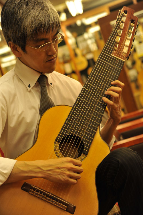 氏のギターは現代主流の音量を求めたギターとは真逆の、音質を追求したギターであり、耽美な音色を有している。 ギタリストの重要なレパートリーとなっているリュートの楽曲を現代のギターで演奏した時の音色の違いからくる違和感を解消するための試行錯誤の末、リュート調弦に近づける為にアルトギター(1弦開放がG)とし、低音弦を5本追加。 バッハのリュート組曲を楽譜通りに演奏することが可能になっている。 993年に惜しまれつつ世を去った氏のギターの中でも非常に良いコンディションの1本。 |