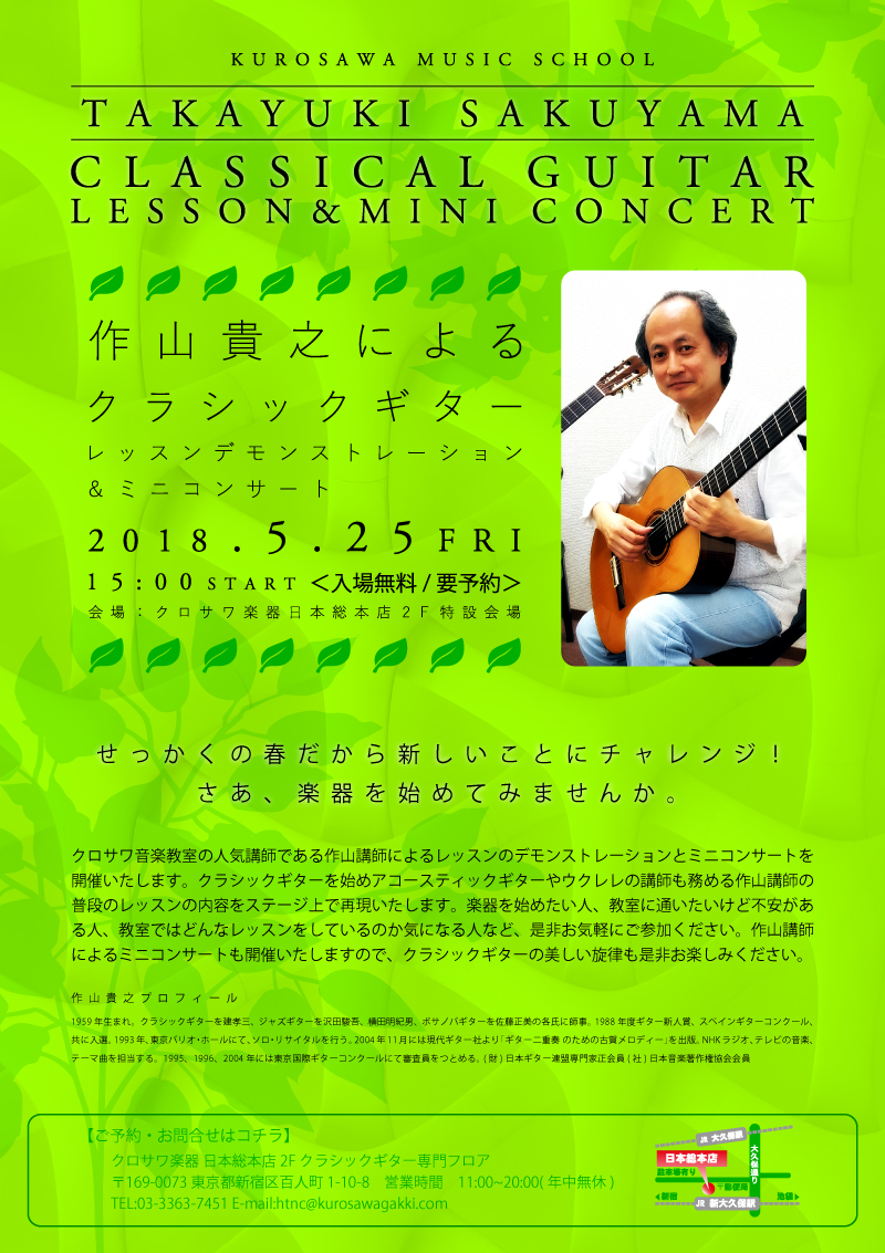 ✉ ご予約はこちらから件名には「5/25 クラシックギターインストアイベント 観覧希望」とご記入いただき、本文にはお名前、人数、電話番号をご記載ください。