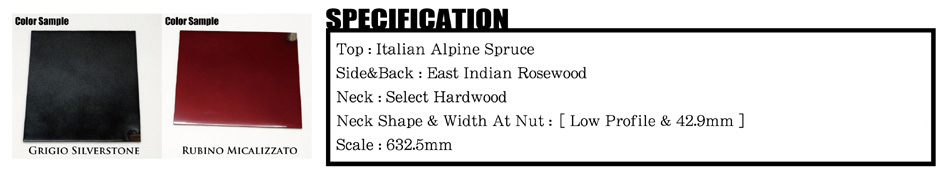 スペック面では、トップ材にイタリアンアルパインスプルース、サイド&バック材にインディアンローズウッドを採用し、なめらかでキメ細かいサウンドキャラクターと致しました。装飾は大部分が“Bellezza Nera”を踏襲しておりますが、サウンドホール周辺のロゼッタをパールヘリンボーンへ変更してカスタムモデルらしい特別感を演出しております。