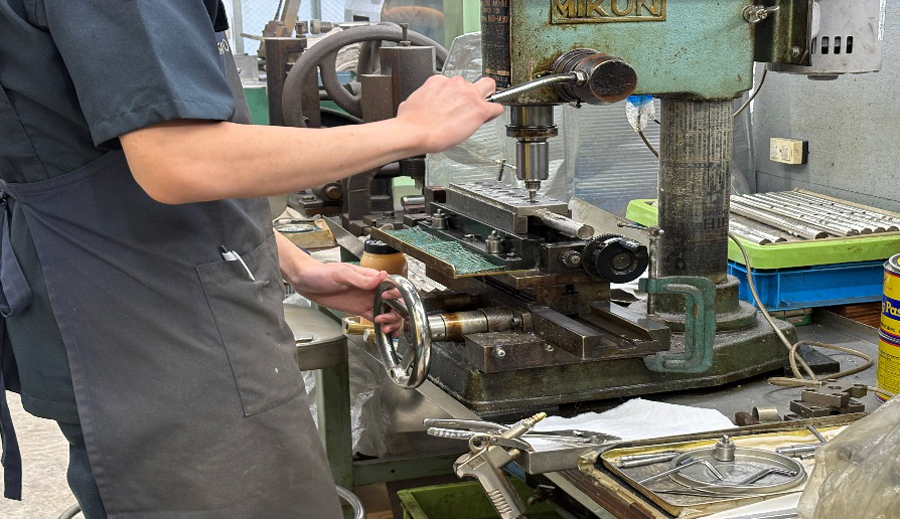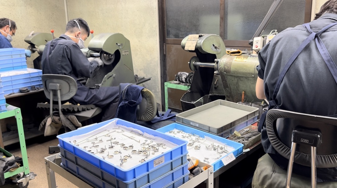 自社工場にて製造されるパーツのプレス工程もご説明いただきました。 小さいパーツですが、一つ一つ段階を経て作られています。 |