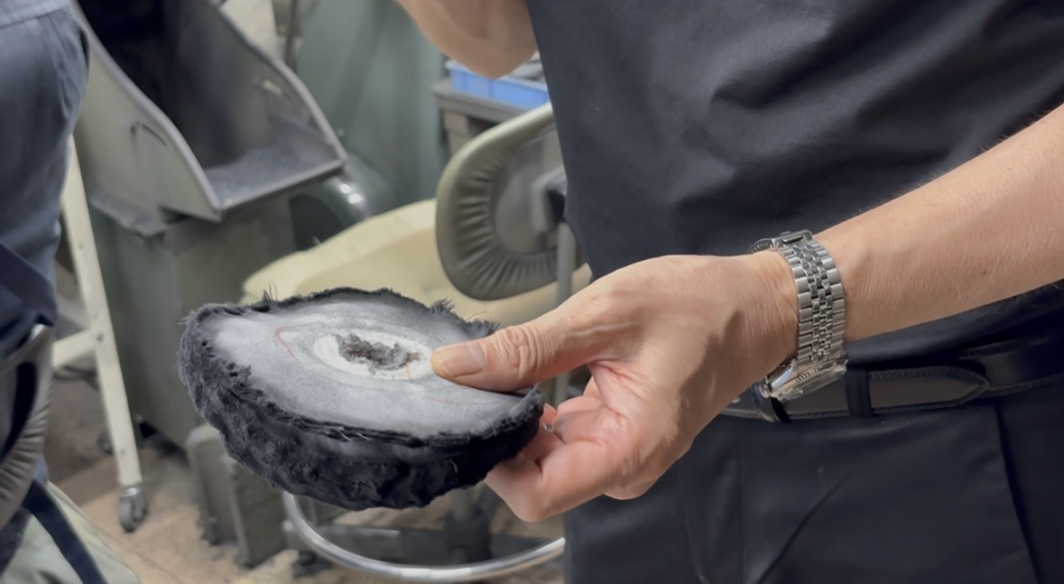 フルート バフ掛け作業(磨き作業)です。 写真左の円盤型の布を回転させ、その布にパーツを押し当て一つ一つ丁寧に磨いていきます。 また、この後のメッキ加工作業も全て三響フルートの自社工場で行っております。 |