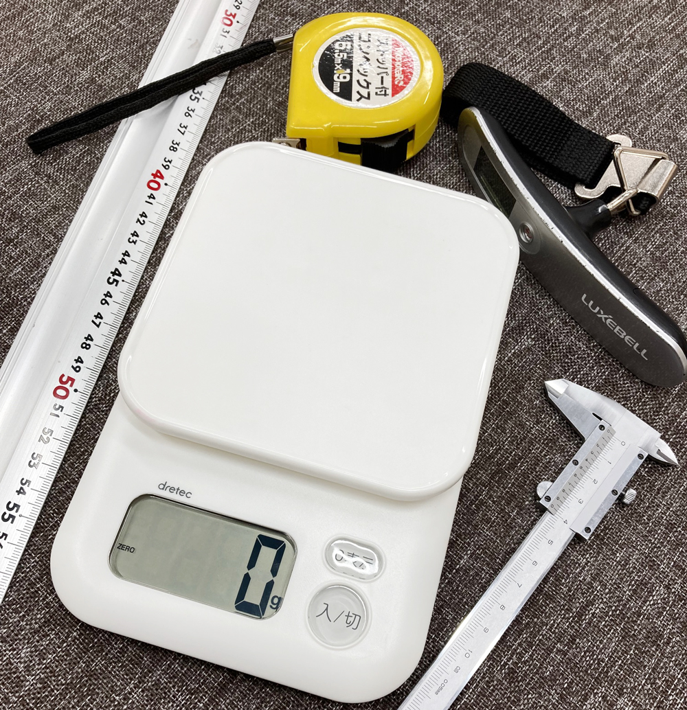 使用計測工具類:キッチンスケール・ノギス・吊りはかり・直尺2種類