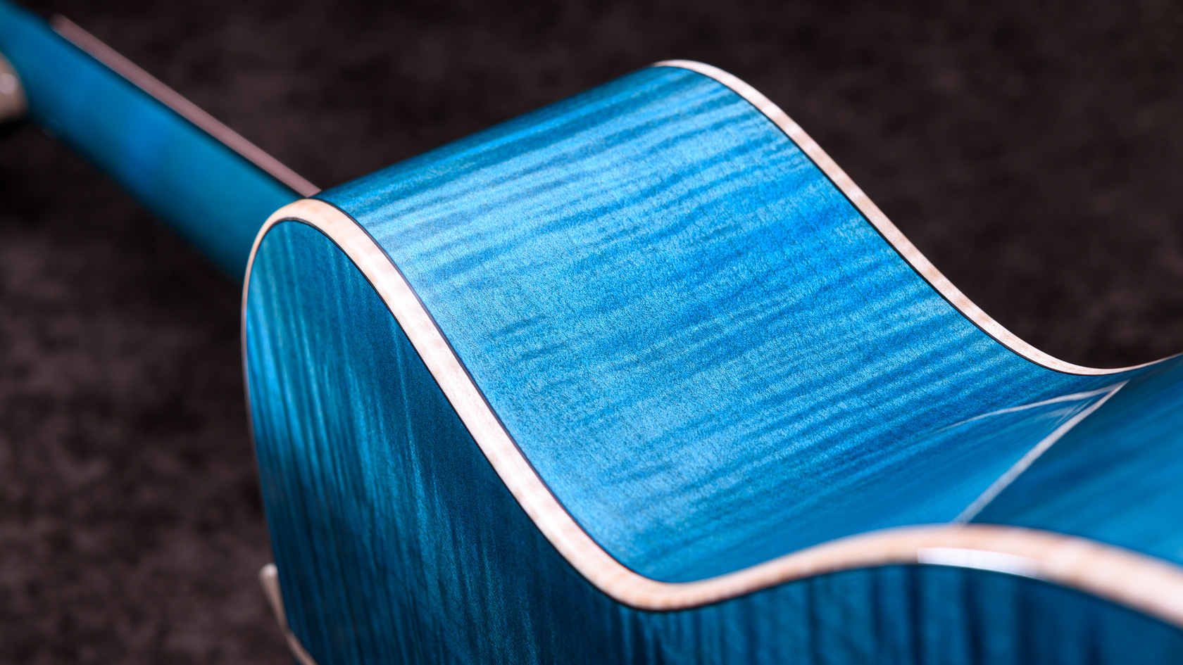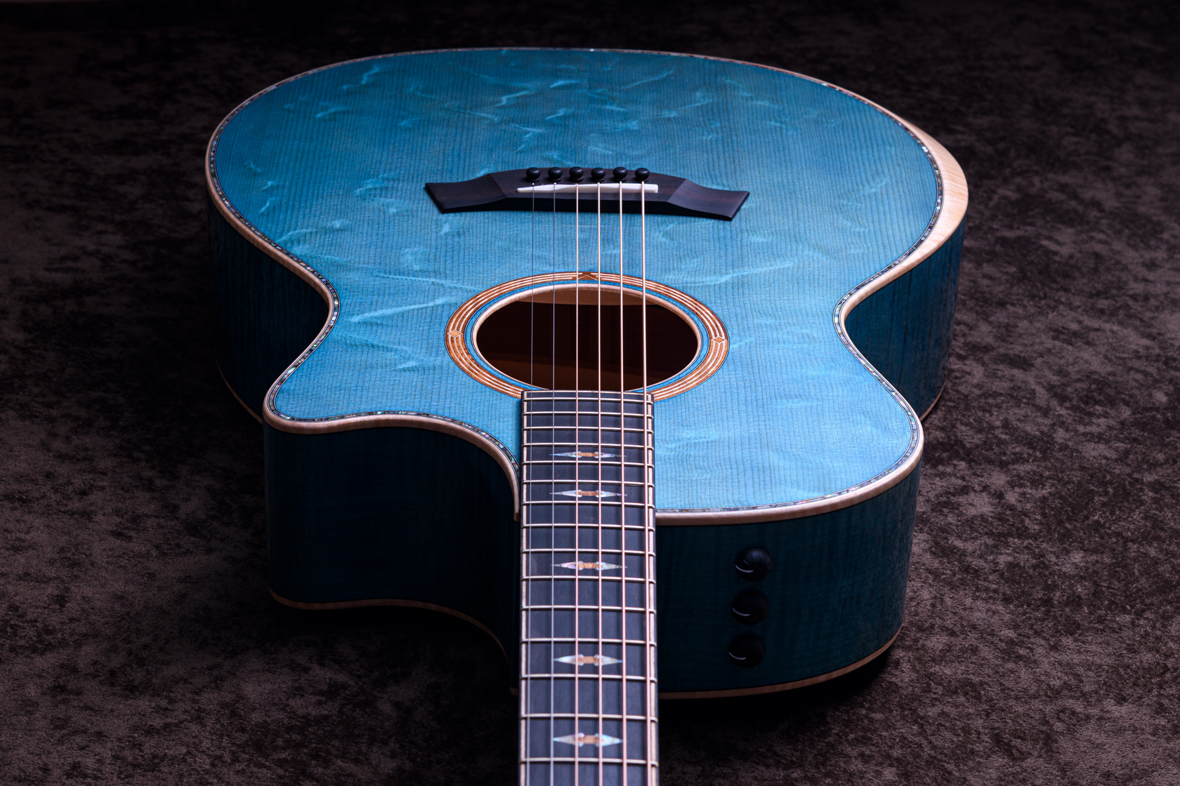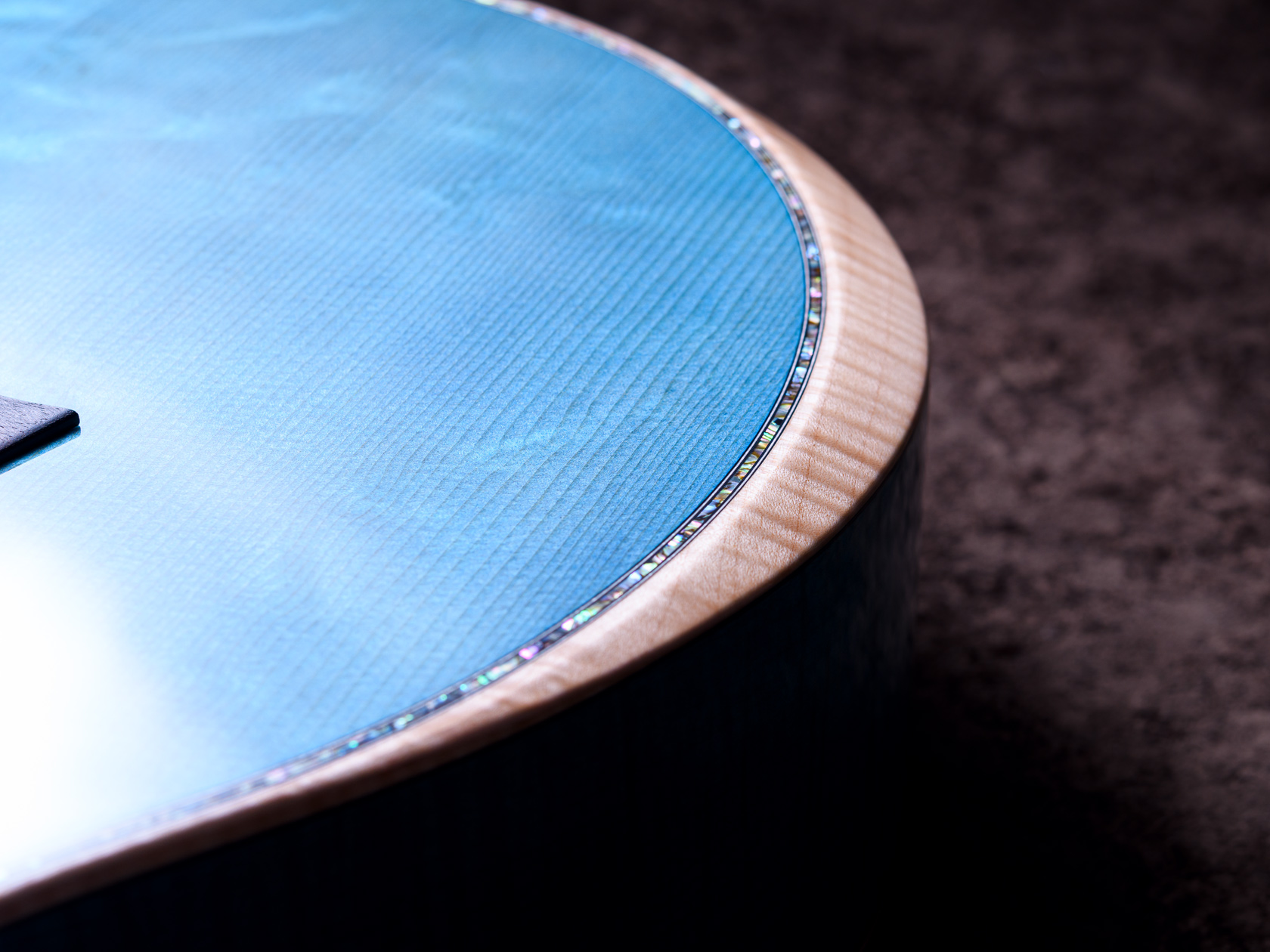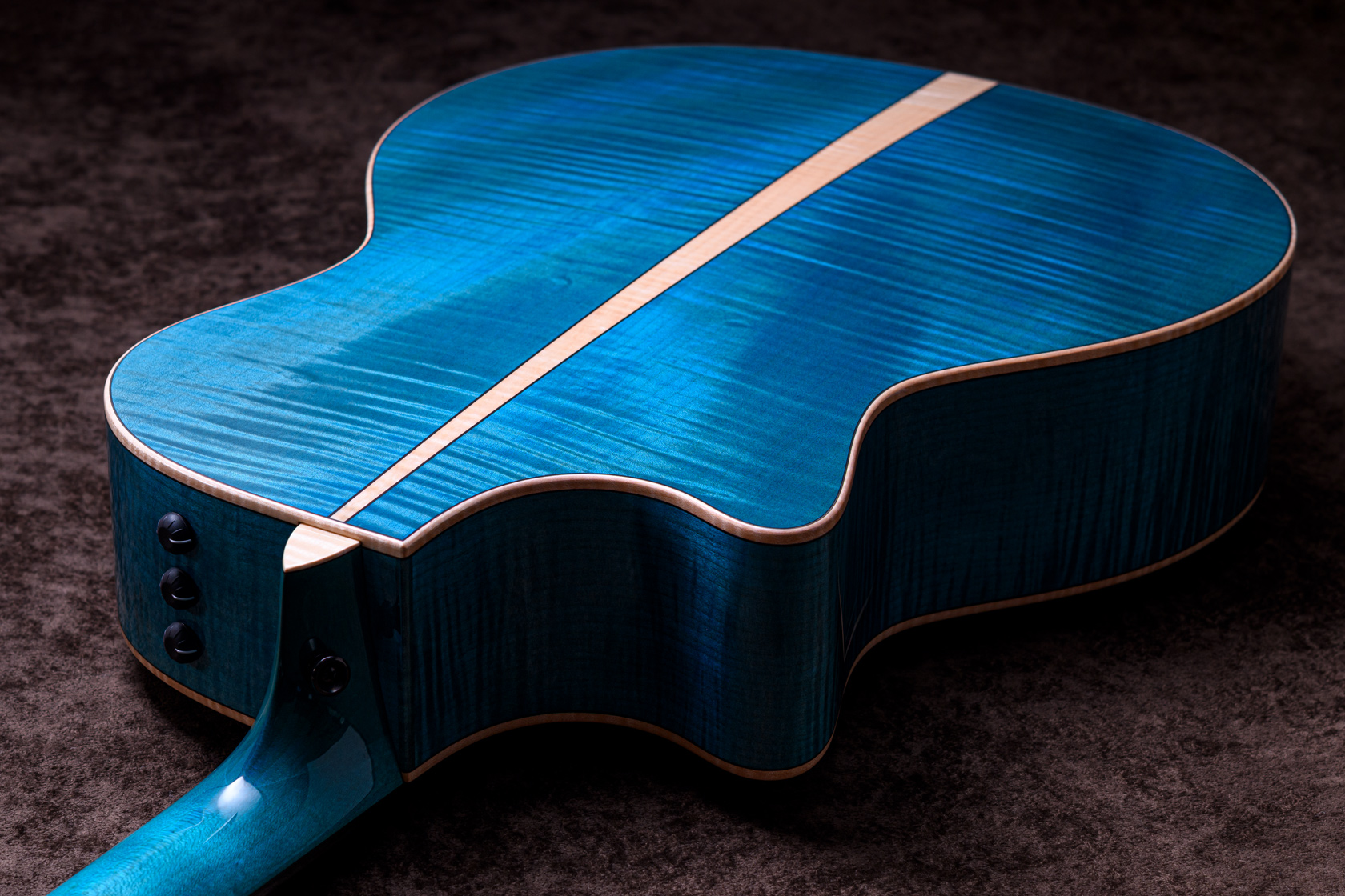 トップにベアクローのシトカスプルースと、豪華な木目のフレイムメイプルが鮮やかな KoiBlue によって魅力的な風合いとなっているカスタムモデル。メイプルバインディング、通常モデルには無いインレイを採用した勇逸無二な1本です!