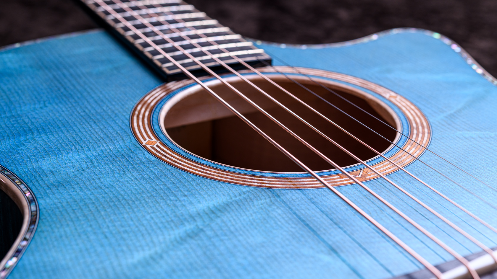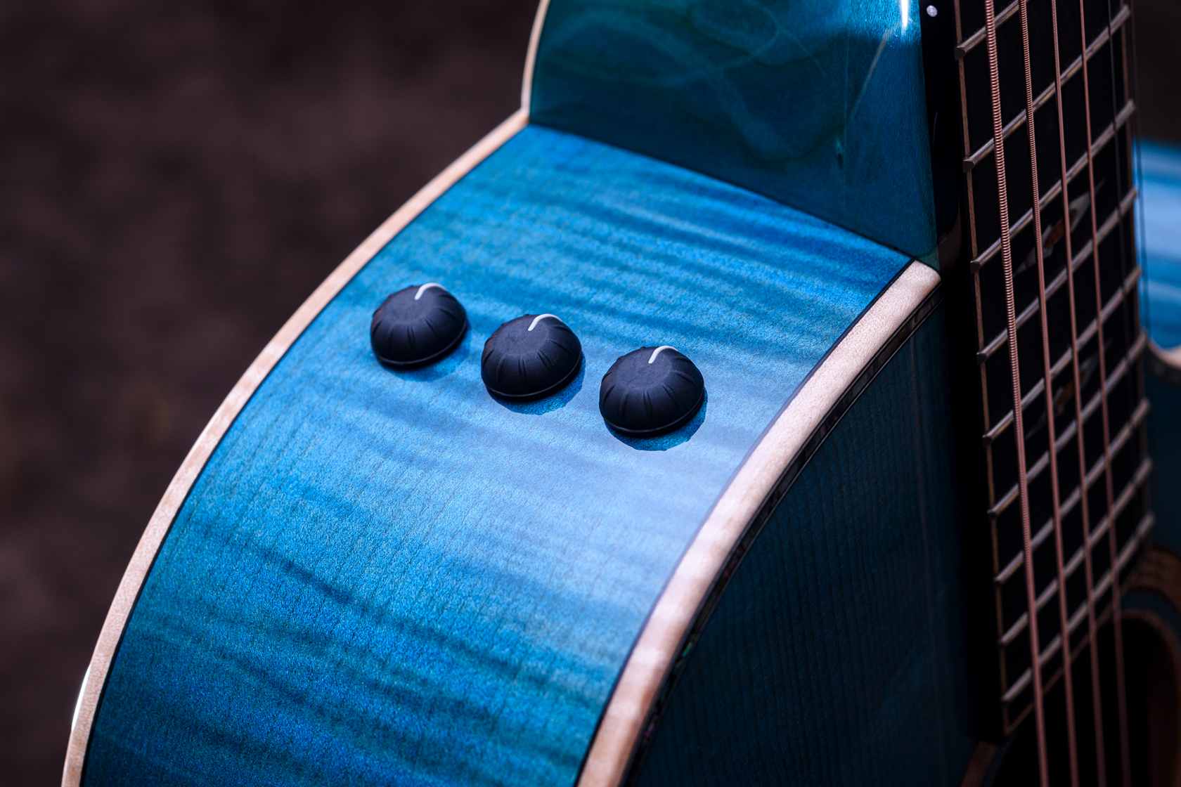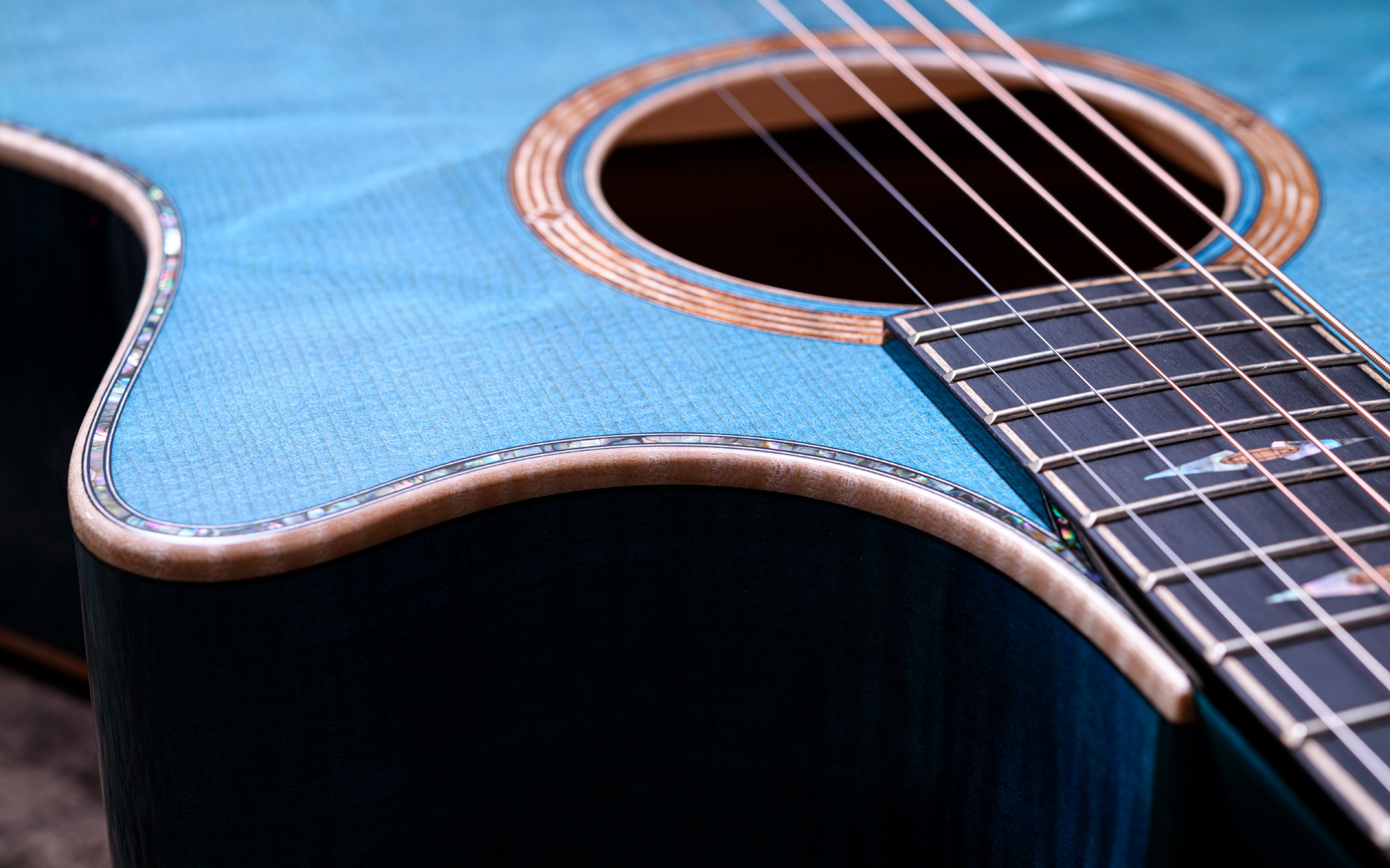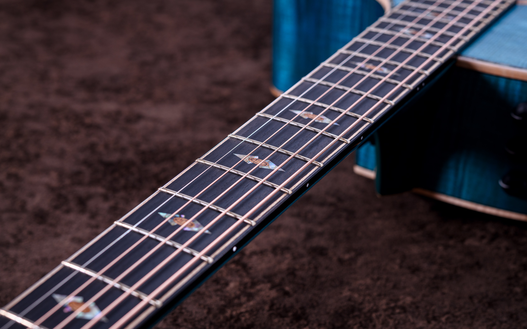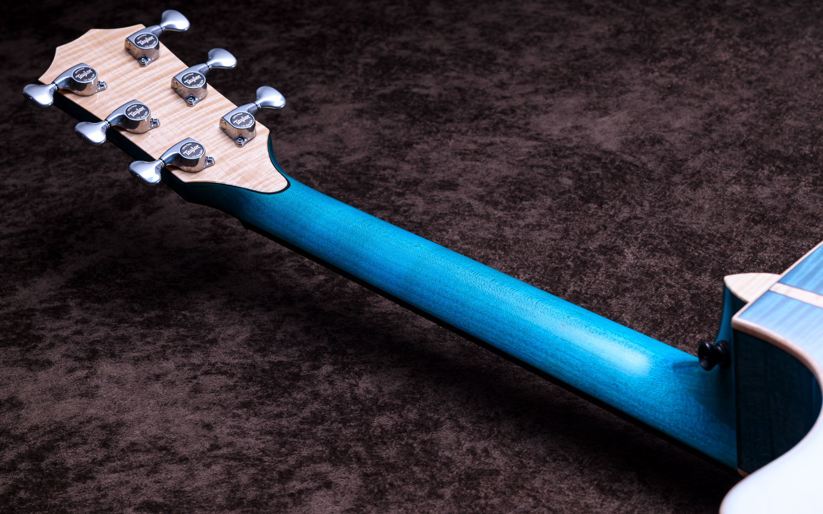 トップにベアクローのシトカスプルースと、豪華な木目のフレイムメイプルが鮮やかな KoiBlue によって魅力的な風合いとなっているカスタムモデル。メイプルバインディング、通常モデルには無いインレイを採用した勇逸無二な1本です!